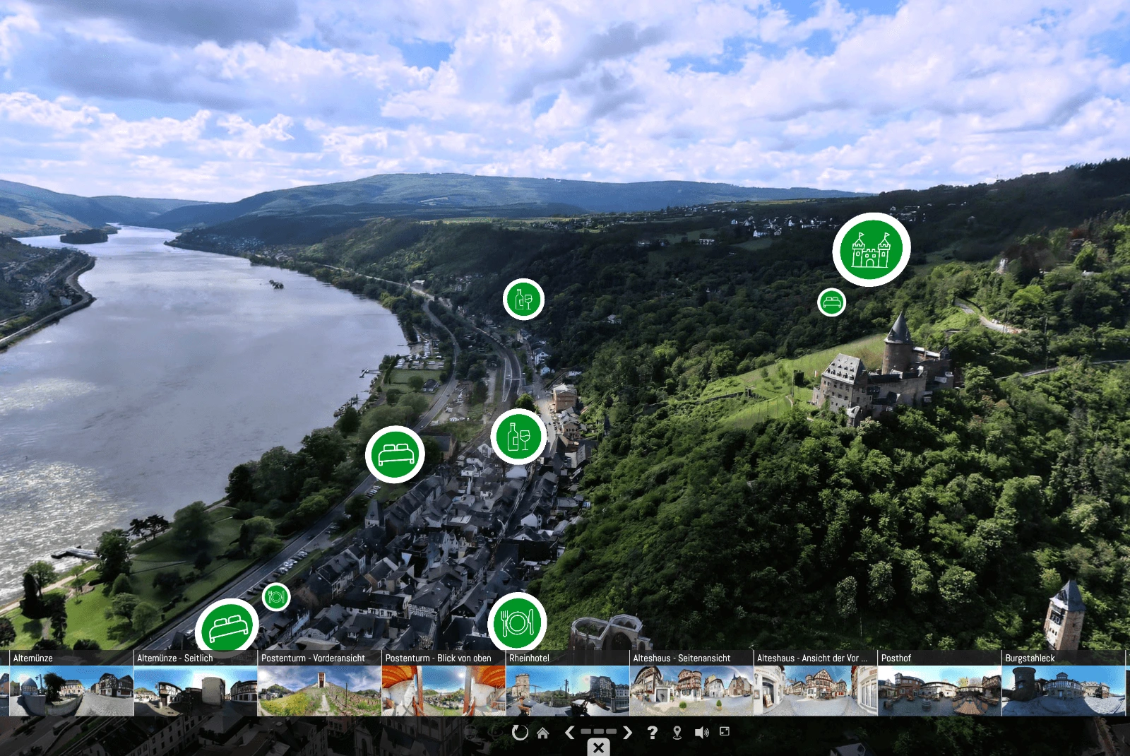 Mit dieser Anwendung wird die historische Stadt Bacharach aus der Luft und am Boden erlebbar. Grundlage ist eine Serie hochauflösender 360°-Panoramen aus Drohnenaufnahmen, die mit Bodenpanoramen in der Altstadt verknüpft sind. Über interaktive Marker lassen sich touristisch relevante Punkte wie Weingüter, Gastronomie, Hotels sowie kulturhistorische Objekte anwählen. Jedes Panorama kann mit weiterführenden Informationen, Medien oder externen Rundgängen ergänzt werden. Die Tour eignet sich damit sowohl zur digitalen Besucherinformation als auch zur Präsentation des touristischen Angebots einer Kommune.